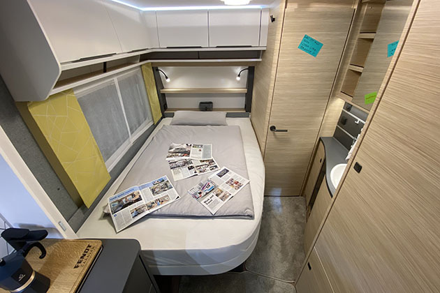 Nella parte anteriore dell’abitacolo invece è predisposto un letto matrimoniale longitudinale alla francese, addossato alla parete. Nella parte alta sono fissati diversi pensili, dallo stile moderno e abbinati ad una serie di mensole a giorno.