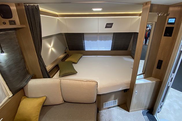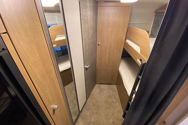 Le due zone notte principali sono poste agli estremi dell’abitacolo: nella parte anteriore, accanto alla porta d’ingresso, è collocato il letto matrimoniale (trasversale al senso di marcia), mentre nella parte posteriore troviamo il letto a castello longitudinale. Elemento di pregio di questa caravan è il generoso bagno, al cui interno troviamo una cabina doccia separata.