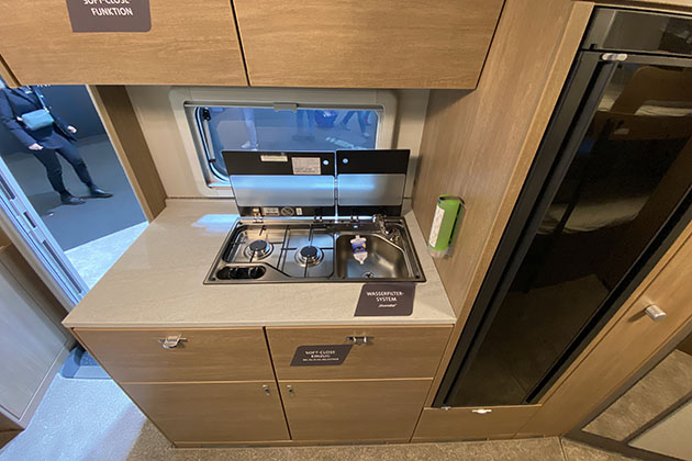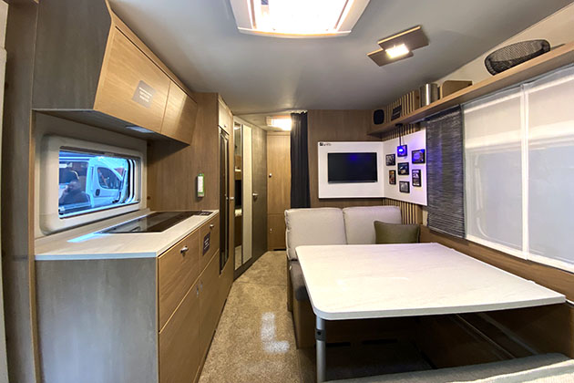 Stiamo parlando di una caravan pensata per la famiglia, con quattro posti letto sempre pronti e la possibilità di arrivare a sei posti letto totali con la trasformazione della dinette. La massa complessiva è di 1.700 kg, a fronte di una massa in ordine di marcia di 1.408 kg. Per chi non ha problemi di traino, è possibile in opzione l’aumento di portata, fino ad arrrivare a una massa complessiva di 2.000 kg. La parete di coda adotta la costruzione “Fold Xpand”, collaudata nel gruppo Knaus-Tabbert, per risparmiare centimetri preziosi in lunghezza senza sacrificare lo spazio interno.