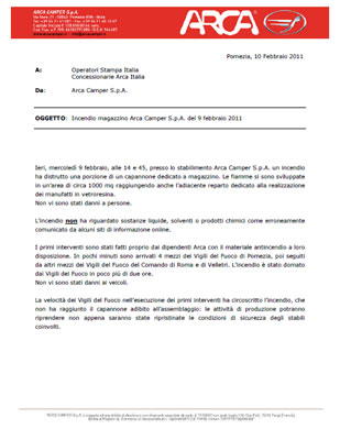 Ieri, mercoledì 9 febbraio, alle 14 e 45, presso lo stabilimento Arca Camper S.p.A. un incendio ha distrutto una porzione di un capannone dedicato a magazzino. Le fiamme si sono sviluppate in un’area di circa 1000 mq raggiungendo anche l’adiacente reparto dedicato alla realizzazione dei manufatti in vetroresina.