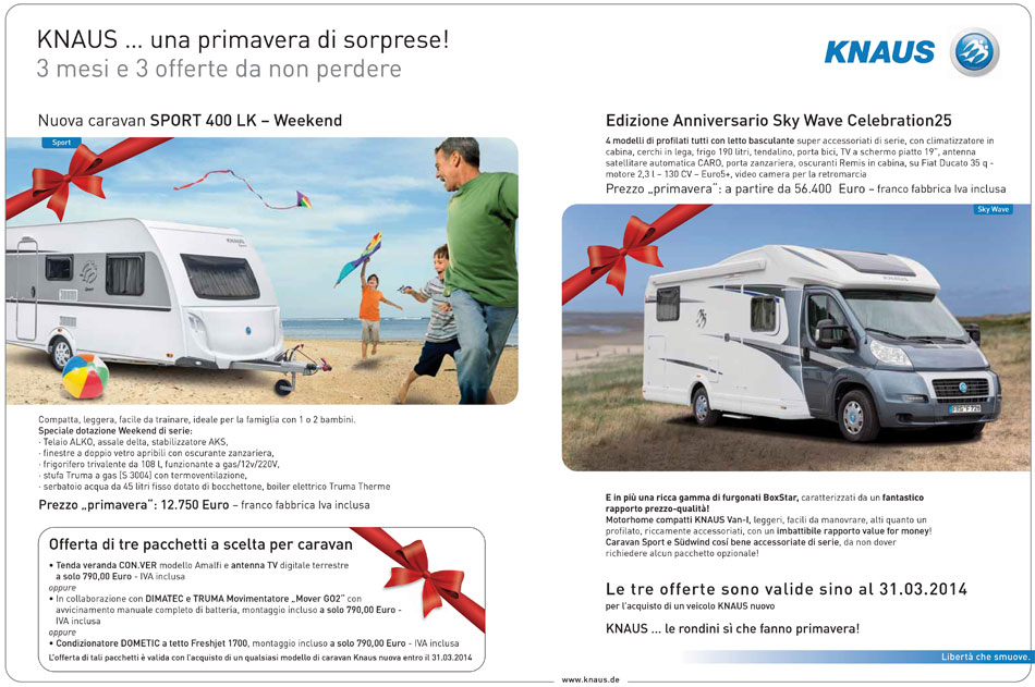 Dal 1 gennaio al 31 marzo 2014 Knaus offre una primavera di sorprese: il celebre marchio tedesco, infatti, propone condizioni di acquisto particolarmente vantaggiose sia sulle caravan che sui motorizzati, con grandi vantaggi per i clienti.