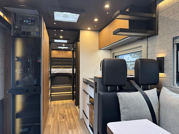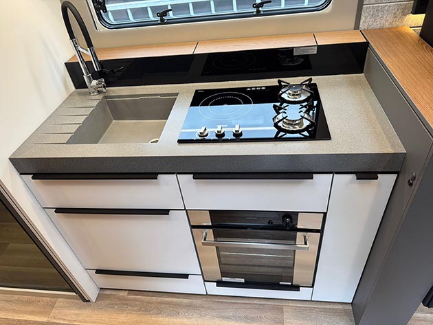 Il layout proposto dall’Arto 88 prevede una camera padronale con letti gemelli in coda e, all’opposto, un living in conformazione face-to-face. Di livello la cucina, dove spicca il piano superiore realizzato in materiale minerale, con lavello perfettamente integrato, e la sua organizzazione di stampo casalingo, con cappa aspirante a scomparsa. Generoso anche lo sviluppo del locale bagno, che offre da un lato il box doccia autonomo e il locale wc, entrambi isolabili tramite una porta scorrevole, e, dall’altro, un grande mobile lavabo esterno affiancato dai capienti armadi guardaroba.