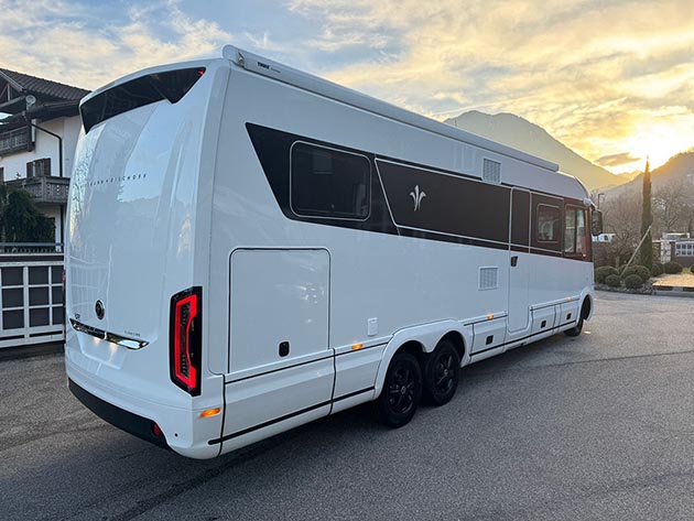 Arto 88, lungo 906 cm e contraddistinto dall’adozione di uno chassis con doppio asse posteriore e da una massa a pieno carico pari a 5.500 kg. Le sue linee esterne, personalizzabili nelle colorazioni, riprendono in tutto e per tutto le attuali linee guida del marchio tedesco, come pure gli ambienti interni seguono fedelmente le ultimissime evoluzioni in fatto di design e organizzazione degli spazi. Doppio pavimento presente, ovviamente, sfruttato al massimo sia per la creazione di vani di stivaggio, sia per l’installazione di parte dell’impiantistica di bordo.