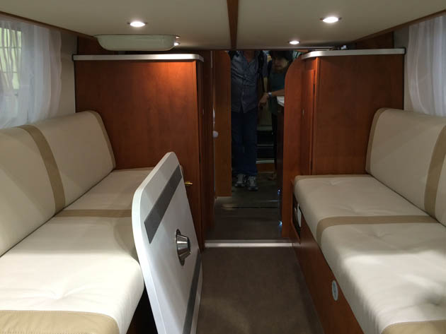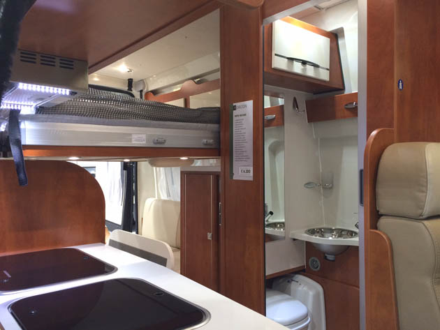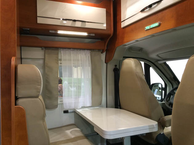 Si tratta di un veicolo allestito sul furgonato Fiat Ducato da 636 cm di lunghezza e tetto alto H3 che presenta, come particolarità, il fatto di avere, nella parte posteriore, una conviviale dinette a divani contrapposti con tavolo centrale amovibile, sovrastata da un ampio letto matrimoniale basculante longitudinale a movimentazione assistita elettricamente. Il resto dell’allestimento prevede anche una seconda classica dinette anteriore che si completa nella sua fruizione con la rotazione dei sedili in cabina; il tutto per un veicll che, nonostante le ristrettezze abitative imposta dall’allestimento furginato, riesce a offrire elevati spazi abitativi.