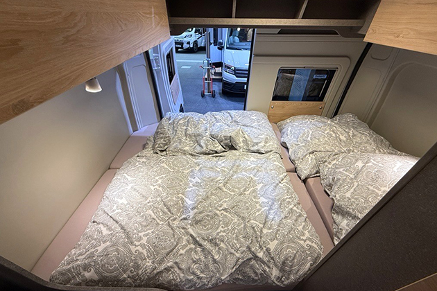 Nella parte posteriore si trova un letto matrimoniale posizionato trasversalmente rispetto alla direzione di marcia, lungo 197 centimetri.