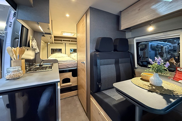 Globebus Performance T16 è progettata per due persone: offre una semi-dinette anteriore integrata dai sedili della cabina, un letto matrimoniale trasversale nella parte posteriore. Elemento importante è il bagno con parete girevole per realizzare una doccia sepatata.