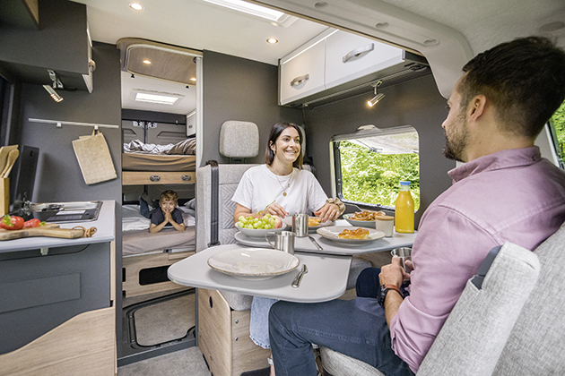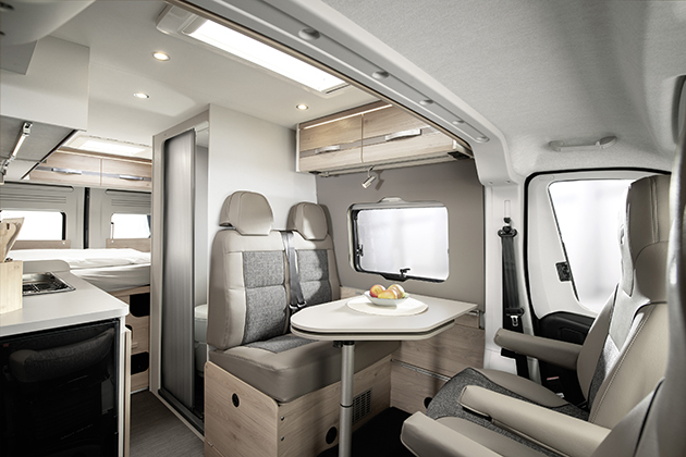Globebus Camp T sono proposti nelle versioni T1 (599 cm, con matrimoniale trasversale) e T4 (663 cm, con letti gemelli). I motorhome