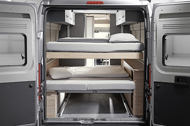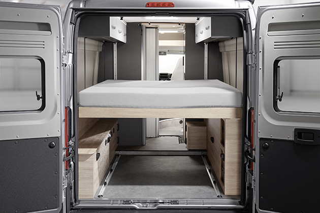 Globetrail 640 HR diventa un van adatto a 4 persone. Ecco dunque che la casa tedesca amplia la sua gamma di camper furgonati con il suo primo modello dotato di letto basculante. Il letto si può sollevare e abbassare manualmente in modo semplice e veloce. Grazie alla regolazione in altezza continua, il letto basculante può essere bloccato in qualsiasi posizione per variare l'altezza del vano di carico e quella di riposo per i due occupanti del letto stesso.