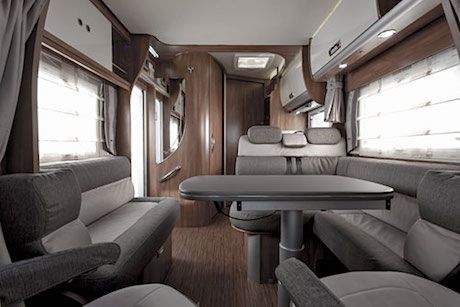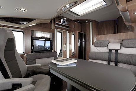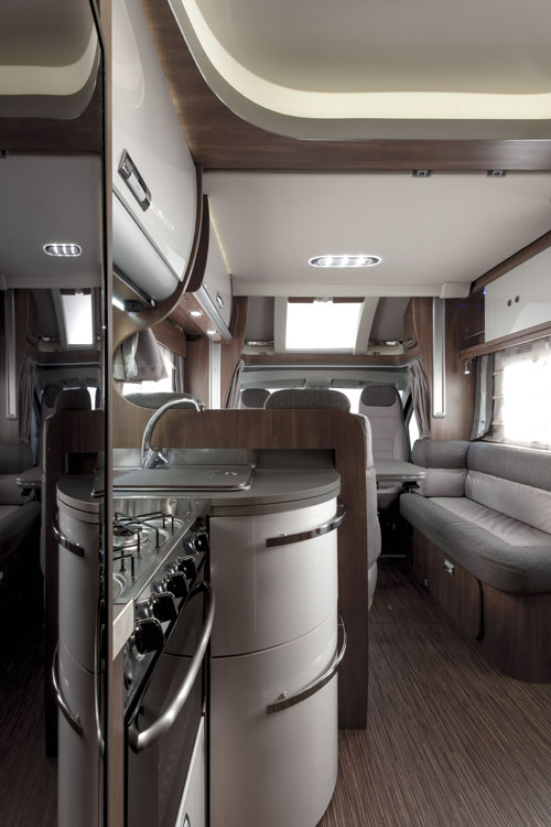 L’atmosfera interna di questi veicoli, moderna e accattivante, gioca sui contrasti di colore dati dalla combinazione dei toni del mobili in Rovere Trentino e il bianco madreperlato, sia delle ante dei pensili della zona soggiorno, sia dei frontali dei cassetti della cucina.