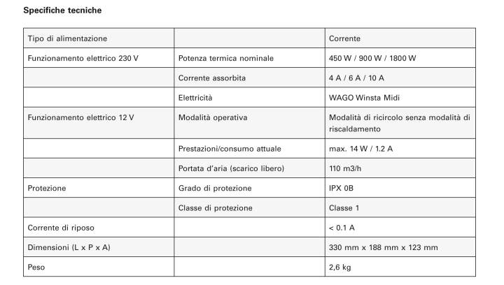 - 100% elettrico: riscaldamento puramente elettrico a 230 V
