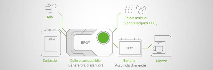 EFOY, efficienti ed ecologiche, si basano sulla tecnologia DMFC (Direct Methanol Fuel Cell) convertono l'energia chimica in energia elettrica senza fasi intermedie e con perdite di efficienza relativamente basse. Oltre all'elettricità, vengono prodotti solo calore di scarto, vapore acqueo e una piccola quantità di anidride carbonica, rendendo l'intero processo sicuro, efficiente ed ecologico.