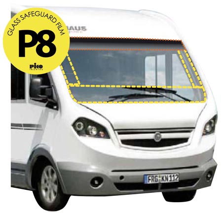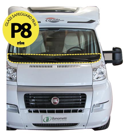 P8 è un film trasparente adesivo che aiuta a proteggere il parabrezza da rotture dovute a impatti di sassi e altri oggetti.