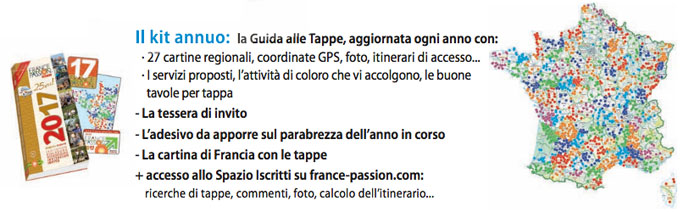 • Per i camperisti che vogliono beneficiare dell’amichevole accoglienza di questa rete è sufficiente procurarsi il kit France Passion dell’anno in corso, che comprende la tessera di invito, l’adesivo dell’anno in corso, la guida e la cartina delle tappe.