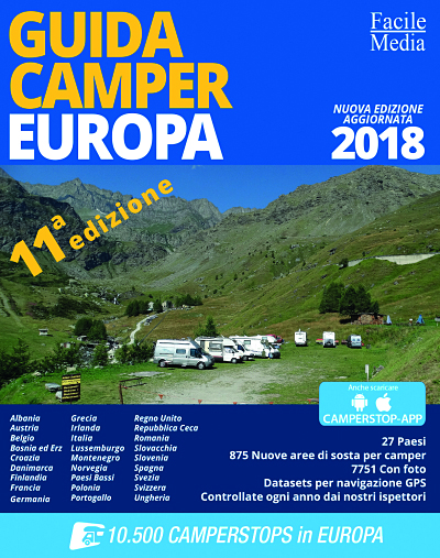 1a edizione della celebre guida per i camper dell'editore Facile Media, i camperisti potranno viaggiare comodamente ancora una volta nel 2018, contando su informazioni aggiornate e verificate. L'ultima edizione è stata ampliata, aggiungendo quasi 1.000 nuove aree di sosta dedicate a chi viaggia in camper. Complessivamente, la guida per i camper contiene informazioni su oltre 10.500 aree di sosta, situate in 27 paesi europei. Tutte le informazioni aggiornate sono anche su dispositivo mobile, nell'app Camperstop.