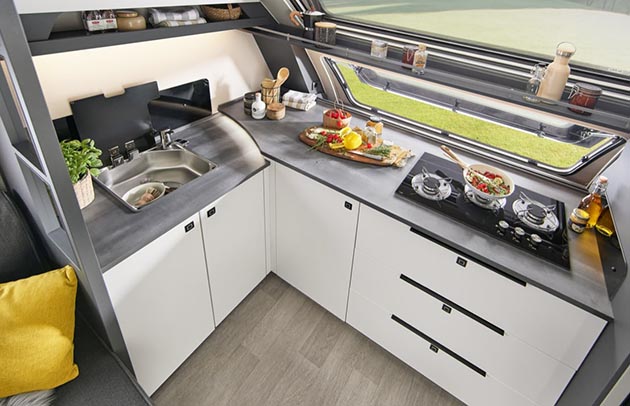 Maxia, con il suo design scandinavo “Hygge”, continua il successo della precedente stagione. Il design minimalista, i colori naturali e l'accoglienza nordica rimangono i suoi tratti distintivi. Tra i numerosi e notevoli extra della gamma, ritroviamo ad esempio la finestra panoramica sopra la cucina anteriore della
