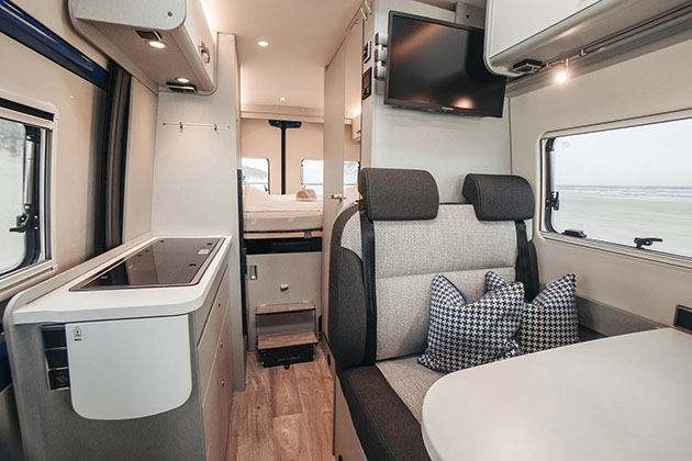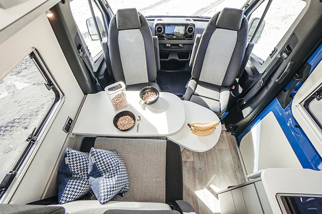 Anche gli interni di questo modello sono ricchi di carattere, stile e cura dei dettagli, come il mobilio chiaro con ante bianche abbinato alla tappezzeria bicolore “Kitami”. Anche nell’abitacolo sono presenti riferimenti all’edizione speciale, come ad esempio la nuova borsa multiuso con ricamo “Blue Evolution” collocata nella zona d’ingresso. Di serie viene offerto anche il tetto sollevabile a soffietto con colorazione esterna nera, che ospita un secondo letto matrimoniale sempre usufruibile dotato del sistema Comfort di casa Hymer dedicato al riposo notturno. I posti letto offerti dall’