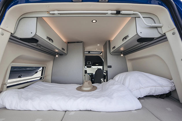 Hymer Free S Blue Evolution sono dunque quattro, grazie alla presenza in coda del classico matrimoniale trasversale, con piano ripiegabile all’occorrenza per aumentare la volumetria del sottostante gavone di carico.
