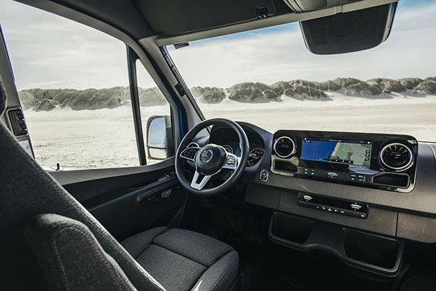 Mercerdes-Benz Sprinter a trazione anteriore. Un modello dal carattere sportivo e moderno, contraddistinto da un design esterno davvero accattivante che combina la particolare verniciatura “Capri Blue” a speciali decalcomanie dedicate alle fiancate laterali e alle porte di coda.