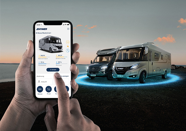 Tramite l’app Hymer connect è possibile controllare, tra altro, la luce, il frigorifero, il sistema satellitare oppure il riscaldamento. Allo stesso tempo possono essere visualizzati i valori del pannello solare, il riempimento dei serbatoi dell‘acqua, lo stato delle batterie e il livello di carburante. L’utente ha la possibilità di controllare se la chiusura centralizzata è aperta o chiusa. Il controllo può avvenire da ovunque: nelle vicinanze dell’autocaravan, l’app si connette con il veicolo tramite Bluetooth. Se le distanze sono più estese, il controllo avviene tramite la rete mobile. A partire da aprile 2021 questo servizio sarà disponibile in 30 paesi europei.