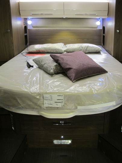 Il cuore del B-Klasse 708 Supreme Line, però, è rappresentato dalla camera da letto posteriore: comoda come quella di casa, ospita un matrimoniale centrale davvero maxi (200x155 cm) posizionato sopra all’ampio garage pensato per ospitare moto, bici e altri oggetti particolarmente ingombranti grazie alla portata che può essere estesa fino a 450 kg. Il letto, dotato di reti Froli e di materassi in schiuma fredda, beneficia di due pratici comodini e di due capienti armadi guardaroba, mentre il letto basculante anteriore può garantire altri due posti letto sempre pronti ed essere richiesto anche con sistema di trasformazione a letti gemelli.