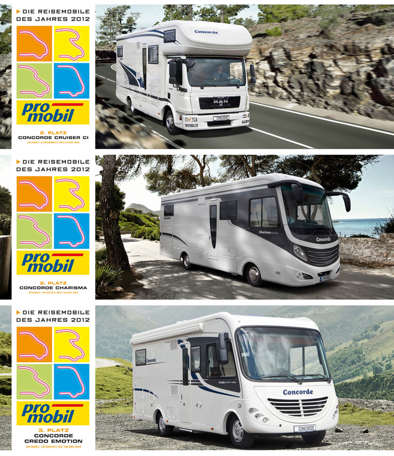 La 26esima edizione del concorso “Camper dell’anno 2012” indetto dal prestigioso mensile tedesco Promobil ha visto la partecipazione di circa 14.000 lettori che hanno espresso le proprie preferenze. Concorde ha conquistato importanti riconoscimenti ottenendo il 1° posto per il piccolo Concorde Compact ; il 2° posto per il mansardato Cruiser C1 e per il nuovo motorhome Charisma III; il 3° posto per il motorhome Credo Emotion; il 4° posto per il motorhome Credo Passion; il 5° posto per il maxi motorhome Liner Plus