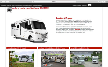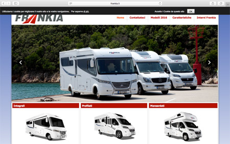 www.frankia.it offre una navigabilità semplice e immediata, consentendo a ogni visitatore di scoprire le varie tipologie di prodotto (mansardati, profilati, integrali) e tutte le peculiarità in termine di versioni, lunghezze, stile, arredamento, componenti tecniche, meccaniche di base, soluzioni innovative e possibilità di customizzazione. Il tutto, naturalmente, si sposa a complete ed esemplificative fotogallery, dedicate sia ai veicoli sia alle varie soluzioni di arredo possibili e combinabili a seconda della pianta, all'area download, con la disponibilità dei cataloghi e delle schede tecniche in formato PDF, e all'area contatti, con la possibilità di interagire direttamente con chi rappresenta