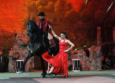 "Fantasia Latina": una scenografia andalusa fa da sfondo a dama, cavallo e cavaliere danzanti al ritmo di un coinvolgente flamenco. Gauchos argentini, al roteare delle boleadoras, terminano lo spettacolo.