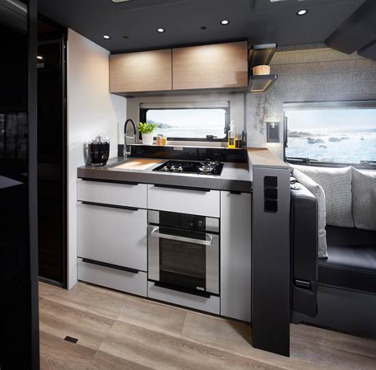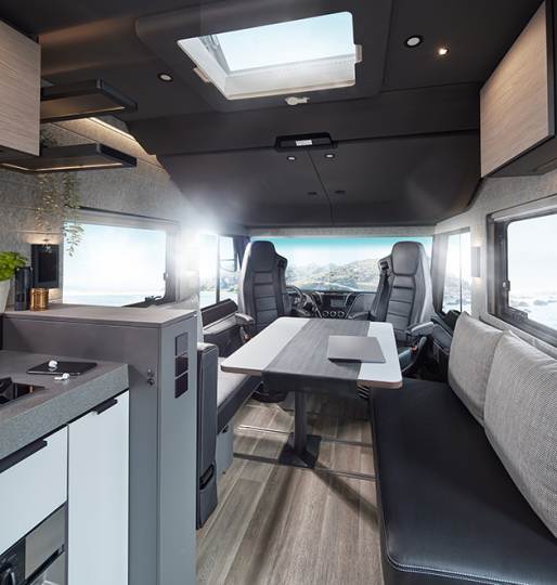 Il design offre numerose possibilità di personalizzazione: l’armadio pensile sopra la cucina, così come i frontali dei cassetti, possono esseri scelti separatamente dalla mobilia dell’abitacolo in legno naturale “Walnut planket” (noce scuro), “Breeze Oak” (rovere chiaro) o bianco opaco. La superficie di lavoro della cucina è disponibile in materiale minerale dall’effetto pietra con lavandino incassato.
