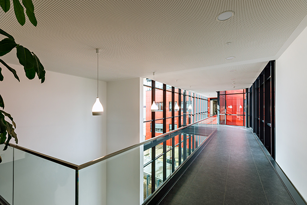 Con la costruzione del nuovo edificio, la superficie degli uffici è aumentata da 3.400 m² a 5.400 m². Sono stati distribuiti su tre piani un totale di 120 locali di lavoro, dei quali ne saranno inizialmente occupati 80. Grazie alle oltre 350 porte installate, tutti i dipendenti hanno a disposizione nel centro elaborazione dati una stabile connessione 10 GB. Soffitti radianti, connessione Wi-Fi ottimale, angoli riunione aperti e materiali quali legno e vetro, costituiscono il presupposto per un’atmosfera di lavoro piacevole. Un ulteriore contributo in questo senso è dato anche dalle aree dedicate ai momenti di pausa con dispenser di acqua potabile gratuita e dalle postazioni di lavoro con scrivanie regolabili in altezza.