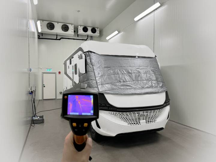 Il test in camera climatica ha seguito la normativa EN 1646-1: al fine di superare la prova, è necessario che la temperatura interna del veicolo passi da -15° a +20° in meno di 4 ore. Per lo svolgimento del test, il camper è stato posizionato nella camera climatica per tutta la notte, con porte e finestre aperte, a una temperatura stabile di -15°C.