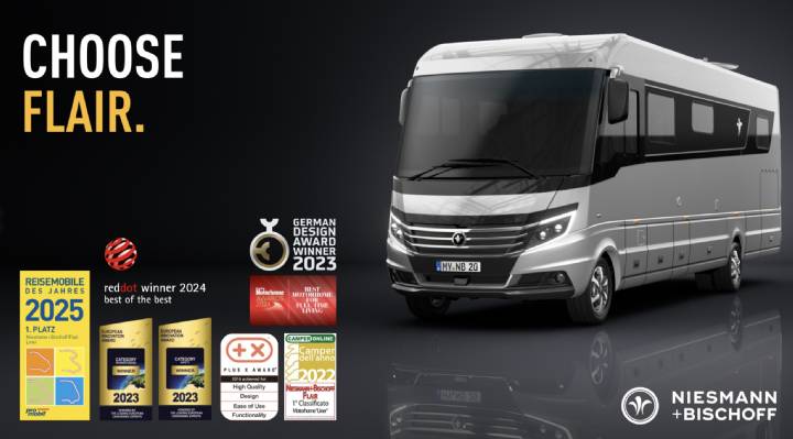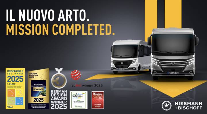 Oltre ai successi registrati da tutti i modelli di Niesmann+Bischoff nel voto dei lettori della rivista promobil, Arto ha vinto molti altri riconoscimenti prestigiosi che enfatizzano senza ombra di dubbio l’ambizione di un design fuori dal comune e gli alti requisiti di qualità: German Design Award: Arto ha ricevuto questo riconoscimento che premia l’eccellenza di design per l’organizzazione fuori dal comune e il potere innovativo del modello. European Innovation Award: Arto è stato premiato per il suo concetto di autocaravan generale elogiando la pianificazione innovativa e studiata del veicolo. Red Dot Award: Il design di Arto nel 2025 è stato insignito del Red Dot Award, uno dei riconoscimenti di design più rinomati al mondo. Per Flair, oltre ai riconoscimenti di cui sopra, sono degni di nota in particolare il “Red Dot Award – Best of the best” del 2024 e il seguente premio nel segmento dell’esportazione: Practical Motorhome (UK):Flair nel 2024 è stato premiato come “Best Motorhome for Full Time Living”, mentre Arto nel 2025 ha ricevuto il titolo “Winner Best Luxury Motorhome”. MMM Out&About Live (UK): Anche nel 2025 Arto è stato insignito come “Winner Best Luxury Motorhome”, confermando la sua posizione di punta nel settore dei veicoli di lusso.