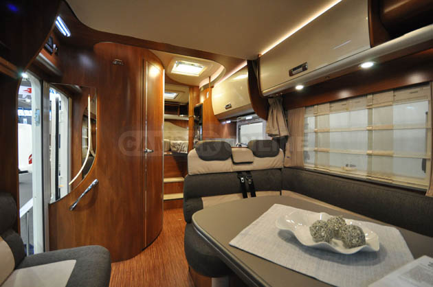 Esordio assoluto al CMT dei nuovi modelli Laika Edition SL, un allestimento particolrmente elegante caratterizzato da ante e cassetti cucina in bianco madreperla, elegante specchio all’ingresso, maniglie dei pensili personalizzate in cromo satinato e tappezzeria in microfibra bicolore.