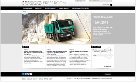 Il sito è una vera e propria sala stampa virtuale in cui gli addetti ai lavori possono reperire tutte le informazioni relative al mondo Iveco, corredate da materiale fotografico e multimediale aggiornato. Nuovi anche il motore di ricerca, il servizio di mail alert per essere aggiornati in tempo reale sulle news pubblicate e l’accessibilità da ogni tipo di device.