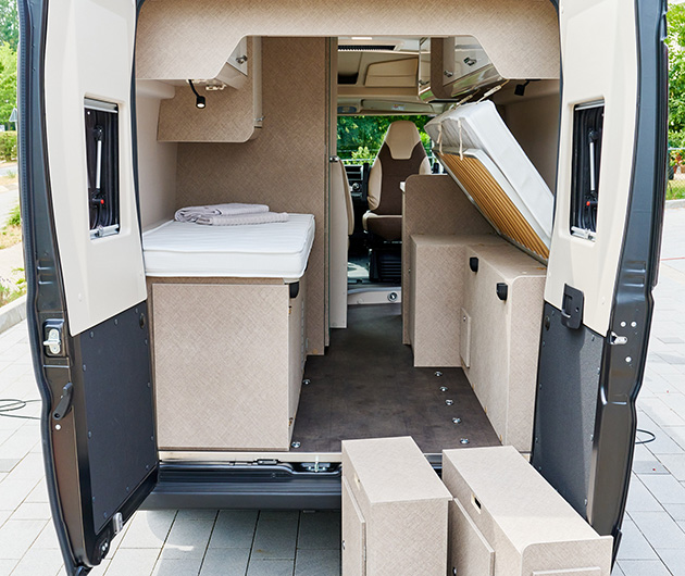 Per ottimizzare lo spazio il brand tedesco ha utilizzo diversi accorgimenti. Ad esempio uno dei due letti arriva a 203 cm di lunghezza mentre l'altro si ferma a 175 cm, potendo contare sul fatto che in media, statisticamente, uno dei due membri dell'equipaggio non raggiunge un'altezza elevata. I due letti longitudinali mettono a disposizione notevole spazio sotto di essi per lo stivaggio, con la possibilità di estrarre due elementi.