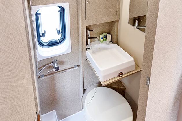 Sotto un letto è ricavato un armadio, e un secondo armadio è sospeso nella zona pensili. Sempre per ottimizzare lo spazio il bagno è compatto e sfrutta la soluzione del lavabo ribaltabile, che rientra nella parete quando occorre fare la doccia o utilizzare il wc. La cucina, oltre al lavello offre un fornello a due fuochi e un frigorifero posto nella parte anteriore, con anta a doppia apertura e la possibilità di essere utilizzato sia dall'interno, sia dall'esterno rimanendo in veranda.