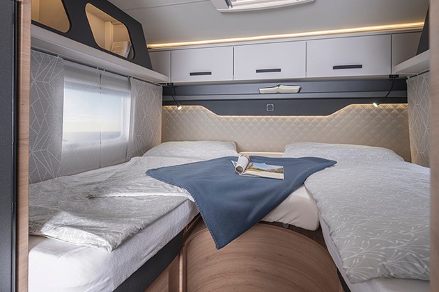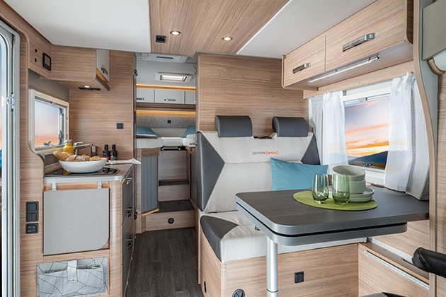 La cucina centrale risulta funzionale e il bagno ottimizza gli spazi con il lavabo scorrevole. Con la nuova Edition [SPICY], Weinsberg propone un CaraSuite 650 MEG dotato di un equipaggiamento di serie particolarmente completo. Oltre ai tessuti Malabar interni, notiamo i cerchi in lega, i fendinebbia, la porta Premium e le finestre Seitz S7 con telaio integrato, ma anche il Media Center da 6,8", la telecamera per la retromarcia e gli oscuranti per i vetri della cabina.