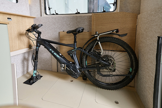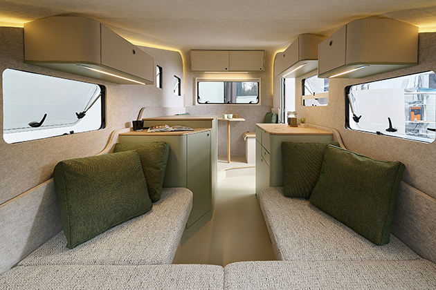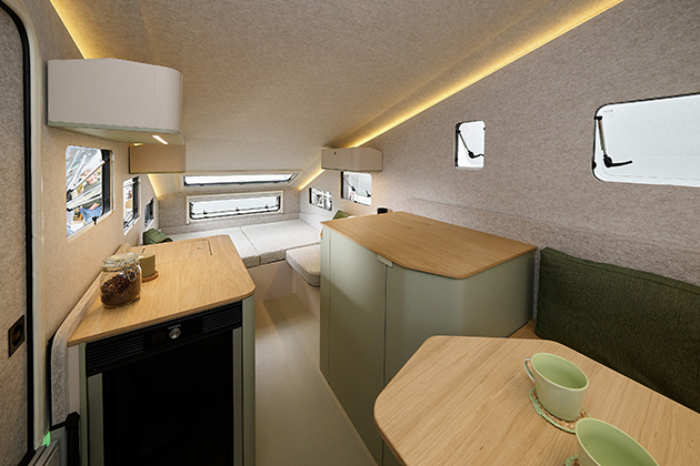 La seduta volutamente semplice all'ingresso può essere ripiegata. Lo spazio di stivaggio risultante funge da garage, caricabile tramite la porta d'ingresso, ad esempio per il trasporto di e-bike e altre attrezzature sportive. La famiglia Machart aveva richiesto questa funzionalità per trasportare e riporre le proprie e-bike in modo sicuro contro i furti. Anche i cuscini di seduta e di riposo del c.fold sono innovativi e ben progettati: al posto delle consuete reti a doghe, sono già integrati cuscini e comodi elementi a molle. Il vano portaoggetti sottostante è accessibile con una sola maniglia, senza dover rimuovere i cuscini. Dethleffs utilizza materiali sostenibili: il feltro sulle pareti interne crea un'atmosfera accogliente, mentre le superfici in impiallacciatura di rovere chiaro completano l'aspetto moderno generale della caravan. La struttura delle pareti è realizzata in Alucore, un composito di alluminio particolarmente leggero e stabile con struttura a nido d'ape, e l'isolamento delle pareti è realizzato in PET riciclato.