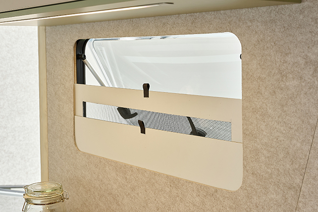 Questo garantisce che tutti gli oggetti rimangano al sicuro durante la guida. Una caratteristica particolarmente intelligente: le tende oscuranti e le zanzariere sono integrate nella parete laterale per risparmiare spazio e ridurre al minimo l'ingombro.