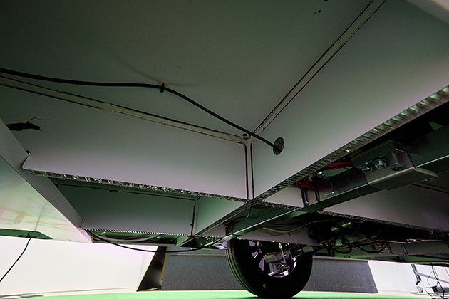 l'innovativo meccanismo di ripiegamento. La parte superiore della caravan pieghevole si abbassa semplicemente premendo un pulsante prima della partenza. Grazie alla sua forma particolarmente aerodinamica, alla larghezza ridotta di 1,90 metri e all'altezza ridotta di soli 1,65 metri da ripiegata, l'aerodinamica e la resistenza all'aria risultano notevolmente migliorate rispetto alle roulotte convenzionali.