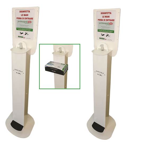 In particolare il Totem Gel mod. ”Premium”, grazie ad un meccanismo comandato a pedale posto alla base, studiato e progettato da Nuova Mapa, evita ogni contatto diretto con il dispenser. Il Totem Gel è inoltre corredato di porta cartello pubblicitario informativo e di mensola porta guanti. E viene fornito completamente montato, pronto per l’uso.