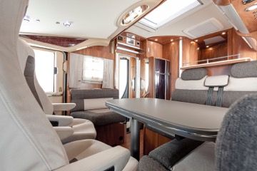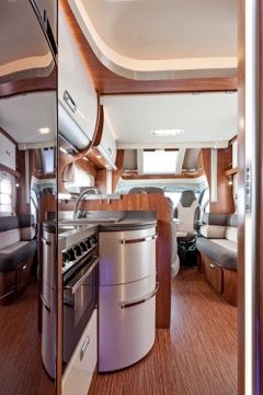 L’atmosfera interna di questi veicoli, moderna e accattivante, gioca sui contrasti di colore dati dalla combinazione dei toni del mobilio e il bianco madreperlato, sia delle ante dei pensili della zona soggiorno, sia dei frontali dei cassetti della cucina. Il grande specchio illuminato all’ingresso della porta cellula, le maniglie personalizzate Laika in cromo-satinato impreziosiscono ancora di più l’interno dei veicoli che, grazie all’utilizzo di una moderna tappezzeria in microfibra bicolore (beige/grigio) di grande pregio, piacevole al tatto, offrono un ottimo livello di comfort.