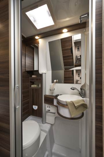 Ecovip Campervan 600, con 599 cm di lunghezza e anch’esso con letto posteriore matrimoniale trasversale, è dotato del nuovo bagno VarioBad, con la parete del lavabo che ruota a liberare una vera e propria doccia separata.