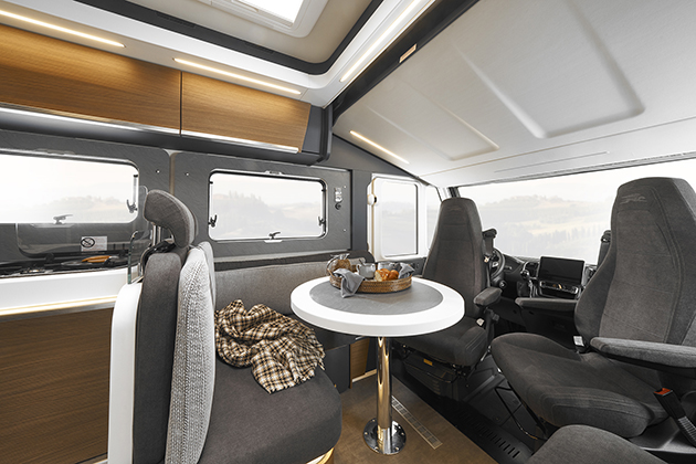 I gruppi ottici Full-LED (con indicatori di direzione e sistema di luci marcia diurne) e i flussi aerodinamici ottimizzati (che slanciano il veicolo, in modo da offrire all’aria la minima resistenza) sono solo alcune delle peculiarità che contraddistinguono la natura automotive del nuovo Kreos motorhome. Il frontale del Kreos H 5109, realizzato in monoblocco di vetroresina, si innesta sulla scocca autoportante e multistrato in alluminio/XPS/alluminio. Il parabrezza, ampio e panoramico, è pensato per offrire la massima visibilità ed è servito da tergicristalli realizzati ad-hoc. Nella cabina vengono utilizzati materiali plastici soft-touch nel sovra cruscotto, nel rivestimento interno della porta guidatore e nel mobiletto laterale, il tutto impreziosito da elementi in ecopelle con impunture a vista. Sempre in cabina, due porta tablet offrono la possibilità di collocare i dispositivi mobili durante il viaggio. La nuova porta di guida a larghezza maggiorata è dotata di alzacristallo elettrico e chiusura centralizzata con telecomando. L’oscurante plissettato è gestibile con comando elettrico. Tramite un pannello di comando, inserito accanto alla porta guida, è possibile accedere alla gestione dell’oscurante, così come alla regolazione degli specchi retrovisori elettrici e al richiamo del gradino di ingresso elettrico.