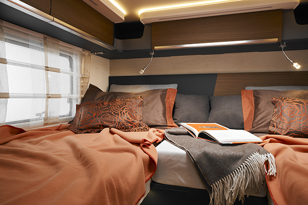 Per l'interno, oltre allo stile moderno e raffinato, sono da notare i materiali pregiati e le soluzioni tecnologicamente avanzate. Sul Kreos motorhome il letto basculante è totalmente integrato al soffitto: frutto di mesi di progettazione, questo letto punta a realizzare una vera e propria camera da letto open space sfruttando un sistema di movimentazione elettrico su cinghie, che offre il massimo di libertà ai lati.