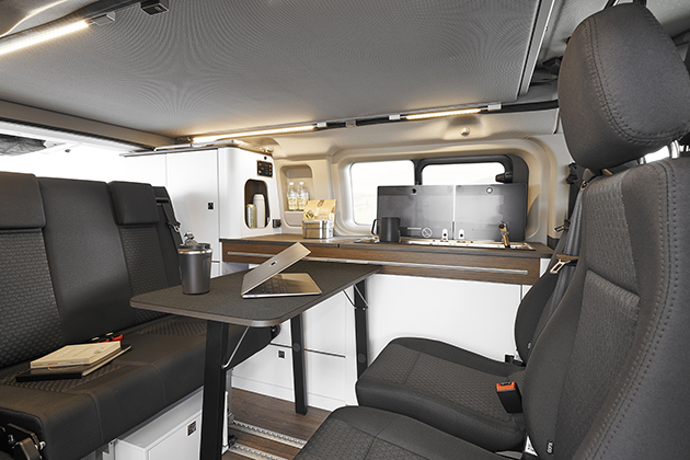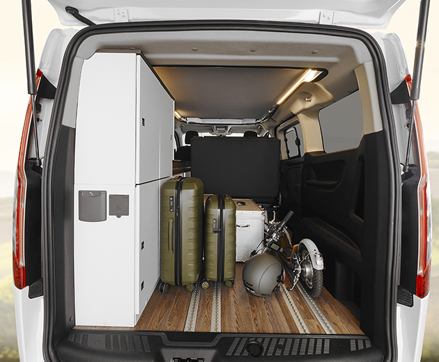 Il sistema audio è dotato di display da 8”, radio DAB+, sistema di navigazione Android/Apple Car Play e retrocamera. Numerosi sono i sistemi di assistenza alla guida, come cruise control adattivo e sistema di avviso di collisione imminente. In opzione due posti viaggio aggiuntivi davanti al divanetto.