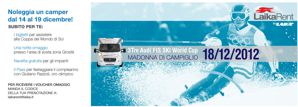 LaikaRent offre la possibilità, per chi noleggia un camper della flotta LaikaRent dal 14 al 19 dicembre, di ricevere in omaggio i biglietti per assistere alla gara di Coppa del Mondo di Sci a Madonna di Campiglio il 18 dicembre. L'offerta prevede anche un pernottamento presso l'area di sosta zona Grostè e la navetta gratuita per gli impianti di risalita.
