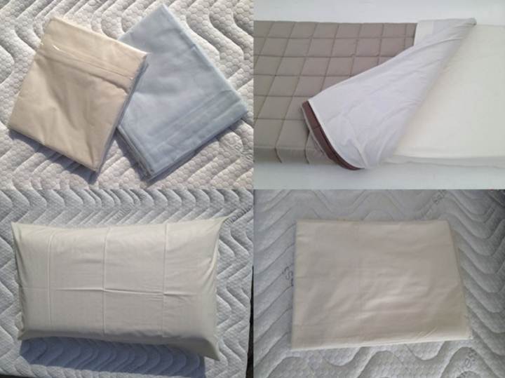 Il Kit è composto da: un lenzuolo, un lenzuolo copri materasso e due federe in cotone; e una trapunta sintetica con un rivestimento sempre in puro cotone.