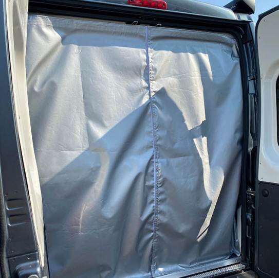 Tenda termica per i portelloni posteriori, composta da due teli termici (realizzati con lo stesso materiale isolante utilizzato per le conosciute ed efficaci tende perimetrali isolanti della cabina guida) che vengono montati su una guida scorrevole, così da poterle aprire quando si deve accedere al camper dai portelloni posteriori.