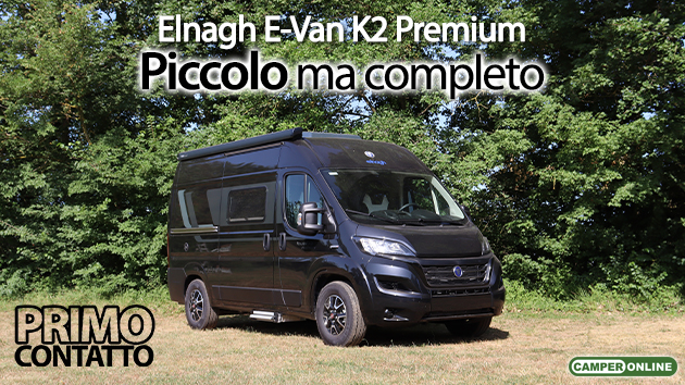 Dimensioni ridotte per l'Elnagh E-Van K2 Premium,  un van adatto ad un equipaggio di due persone, che garantisce un’eccellente mobilità su ogni tipo percorso. E’ uno dei modelli con cui Elnagh entra nel segmento dei furgonati e si fa notare per la dotazione completa e un arredo di buona qualità. Di serie c'è quasi tutto: retrocamera, veranda, pannello solare e tanto altro.