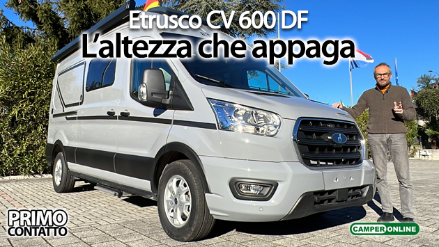 Nella gamma van di Etrusco è arrivato anche il modello CV 600 DF: è un furgonato di taglia media allestito sulla base meccanica Ford Transit. Oltre alla versione base, è disponibile nella ricca variante Complete Selection, con una dotazione di tutto rispetto che include vari pacchetti opzionali. Questo van, la cui lunghezza sfiora i 6 metri, ha uno schema abitativo classico, con letto trasversale posteriore e semi-dinette anteriore, ma non mancano gli elementi singolari. Ottima l'abitabilità data dall'altezza interna notevole.
